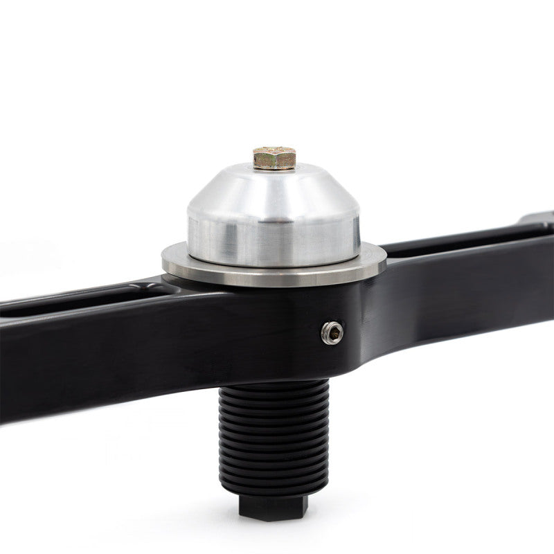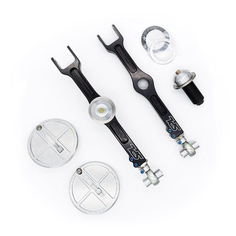 SPL Rear Mid Links (RML) replace the stock spring bucket arms to offer complete control over rear toe, rear spring rate, and ride height. The threaded spring perch accepts common 60mm ID springs and allows corner weighting with fine adjustment of ride height. The upper spring perch also has a linear adjustment range to match the spring location and reduce misalignment.We recommend pairing our midlinks with our eccentric lockout kit (ELT Z34) to eliminate the stock eccentric bolt, which can slip under significant load and ruin your alignment, leading to aggressive tire wear and poor handling in most cases. This also prevents the need to re-align the upper spring seat every time the eccentric is adjusted.Does not include springs.BenefitsLarge Range of Toe AdjustmentLightweight: 4.828 lbs (2.19 kg) per Side with Upper PerchesQuickly Change Rear Spring RatesAdjust Rear Ride HeightLess Rear Toe Change from Bushing DeflectionMaintenance-Free, US Made, PTFE-Lined FK BearingsMaterials6061-T6 Aluminum Arm Body6061-T6 Aluminum Spacers & Spring Alignment Pucks4130 Chromoly Steel Double Adjuster304 Stainless Steel Spring SeatsTi-6Al-4V Titanium Hardware (Anodized Blue)Swift 60mm Spring Thrust Washers